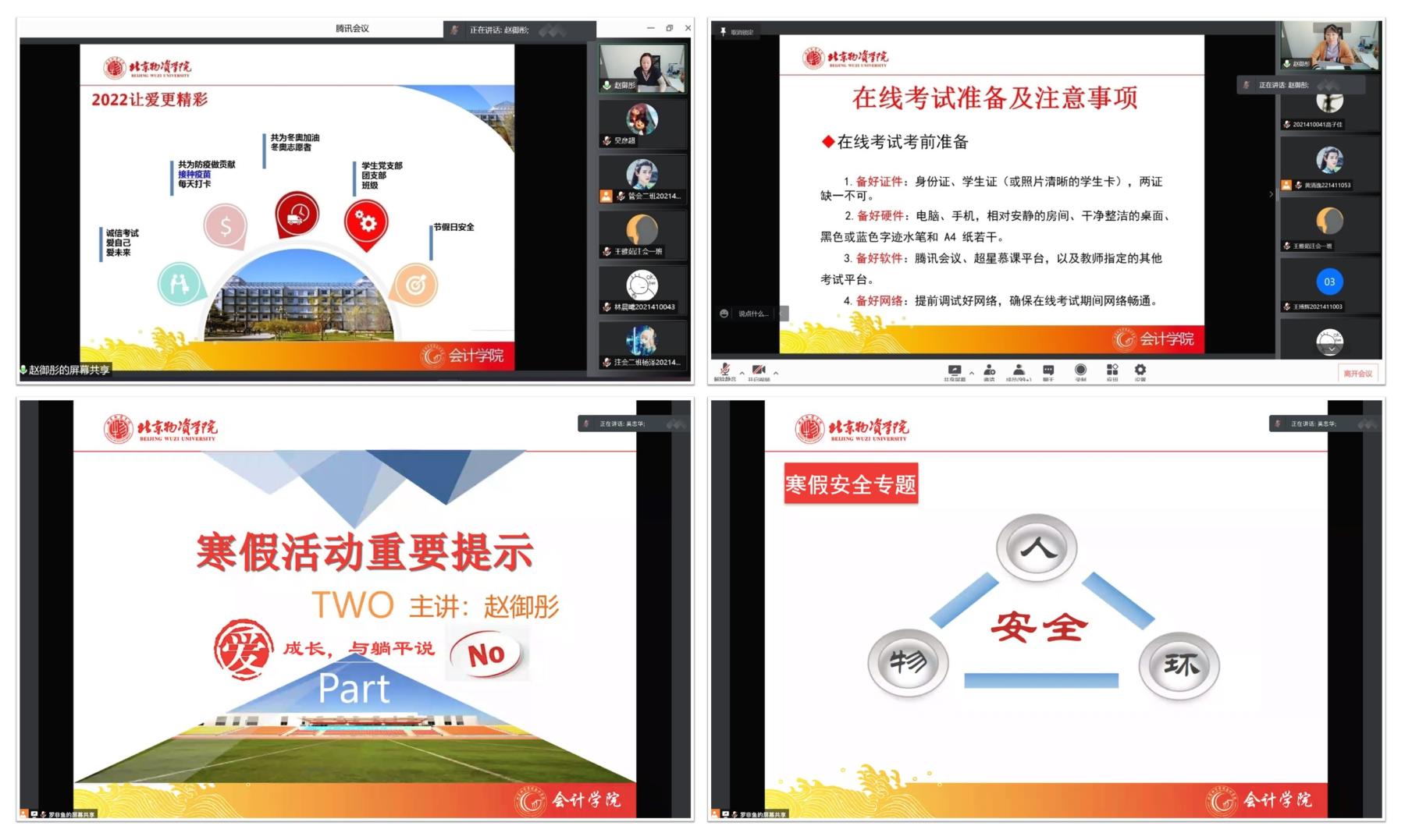 针对假期安全问题,梁昀老师以“爱生命,与危险说NO”为主题进行了分享。梁老师从人身安全、物品安全、环境安全三个方面出发,结合具体案例分享了寒假常见安全隐患和防范应对方法,并对常态化疫情防控、警惕电信网络诈骗、远离传销邪教进行了重点强调。