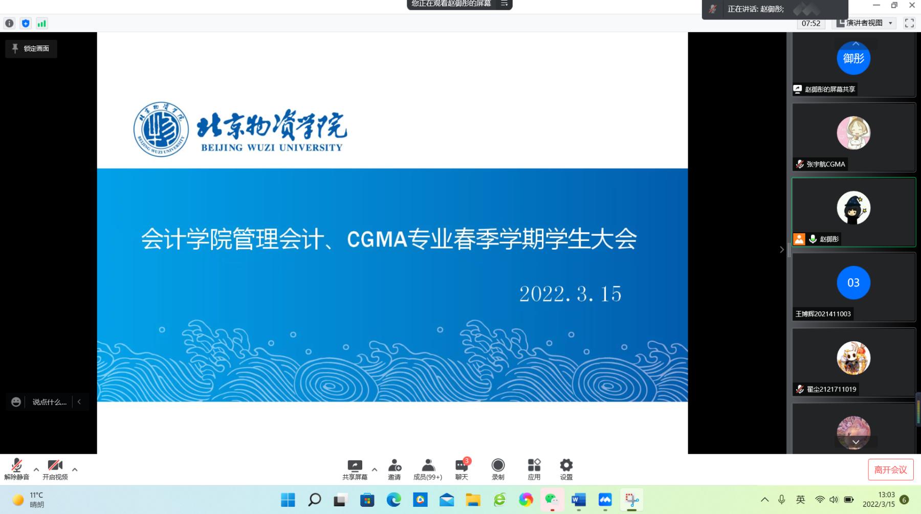 赵御彤老师从2022年春季学期师生返校安排、挑战杯比赛、素质积分、计算机考试、公费医疗、体温打卡和线上课出勤这七大方面向大家做出了简要的说明,为大家近期所出现的问题进行了详细的解释,并提醒大家按时进行每日健康打卡,做好疫情防控。期待与大家的再次相见。