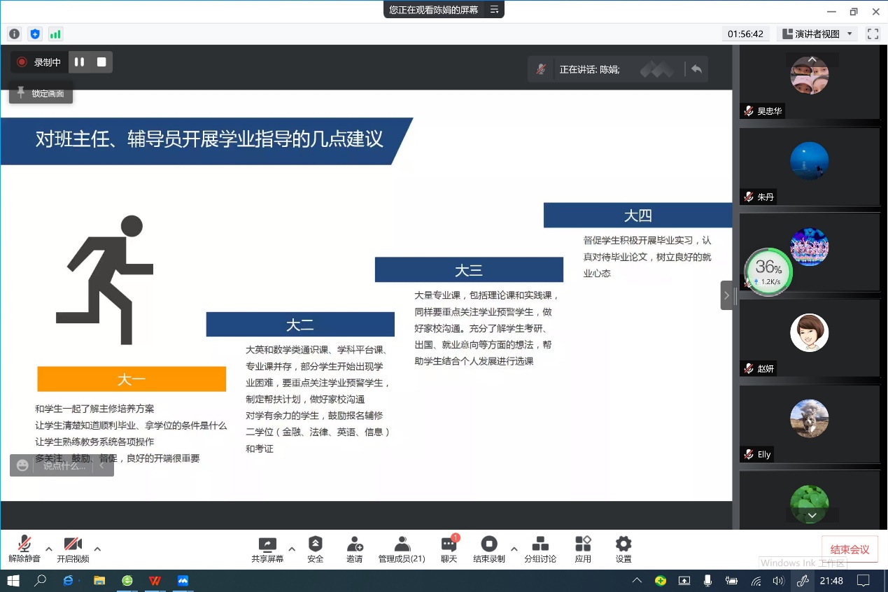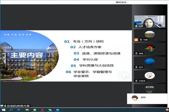 陈娟副经理从专业(方向)结构、人才培养方案、选课以及课程修读与成绩、学风认定、学科竞赛与大创项目、学业警示以及学籍管理与毕业审核6大项涵盖员工从入校到毕业的学业相关规定,进行了精心的准备、详细的解读和系统的梳理。陈经理指出员工学业问题是庞大的体系,是关系到员工学业完成顺利毕业的重要方面,作为班主任和辅导员与员工联系紧密,要及时关注、精准帮助、有效推动。同时,根据不同年级的学业特点,陈娟副经理给出了中肯的工作建议。会上,还就班主任、辅导员提出的日常工作中遇到的员工学业问题进行了耐心解答。