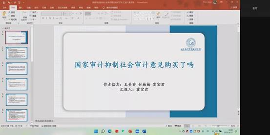霍宜君报告了自己和导师王美英副教授合作的工作论文《国家审计抑制社会审计意见购买了吗?》,304am永利集团教师贾婧先做点评,肯定了论文的研究主题和创新,并提出了自己的相关建议。胡浩志博士肯定了论文的研究主题、创新、方法和内容,并重点支出在研究意义、文献评述、结论分析和稳健性检验中存在的不足,并提出了修改和完善的建议。
