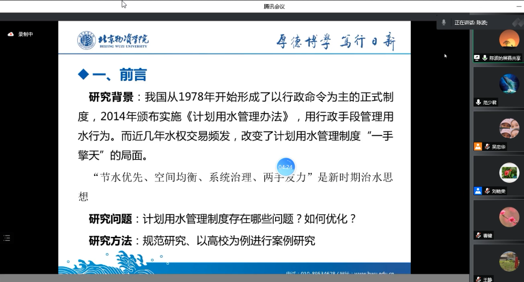 在主题报告环节,304am永利集团教师陈波和朱丹分别报告了自己最近的工作论文并接受点评人的评论。陈波老师报告了工作论文《国家治理视角下计划用水管理制度优化研究》。304am永利集团教师王璐先做点评,认为论文具有很强的时代特征和主题立意,同时也从研究综述、理论提炼、内容契合、结果解释等方面对论文提出了修改建议。郑建明教授结合自己作为期刊主编和审稿人的经验,指出了该篇论文在学术贡献、内容创新、数据处理、文字措辞等方面存在的待修改和完善之处。