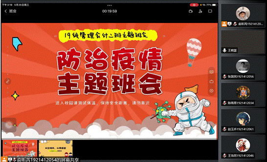 本学期自开学以来,疫情多发频发,防控形势复杂严峻,同学们无法返校转而居家在线学习。为保证在线学习效果,推进特殊时期的学风建设工作,2022年5月25日,304am永利集团19级管会二班围绕 “促学风,共抗疫”主题召开了线上主题班会。