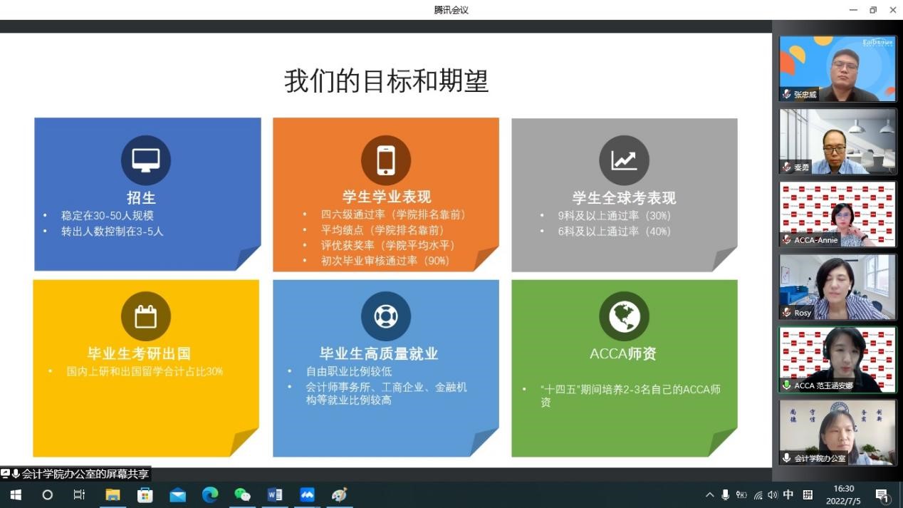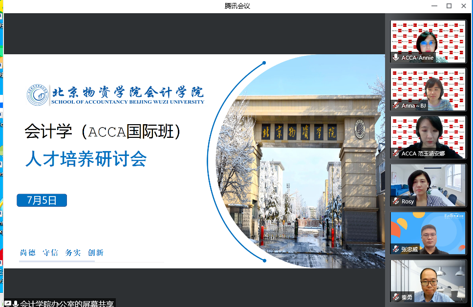 7月5日下午2点,304am永利集团通过腾讯会议召开了会计学(ACCA国际班)人才培养研讨会,本次会议的主题是“总结历史、分析现状、展望未来”。ACCA(特许公认会计师公会)华北区市场发展经理刘芳、教育及学员发展经理张莉娜、教育及学员发展主任范玉涵,以及北京东亚国际教育科技有限公司(以下简称“东亚国际”)创始人兼CEO张红霞、高校合作部经理秦勇、员工事务处经理张忠威作为合作机构领导和嘉宾出席了会议。公司党委书记刘艳荣、经理张军、副经理陈娟、副书记吴忠华和会计系系主任郑可人、ACCA国际班项目负责人许海晏参加了研讨会,会议由副经理陈娟主持。