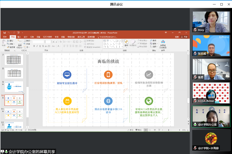 围绕这些挑战和问题,参会人员分别发表意见,分析原因,提出应对措施和解决办法。东亚国际创始人兼CEO张红霞建议ACCA公会优化注册报名政策,帮助员工尽快通过基础知识模块课程的统考,增强后续学习和考试的信心。ACCA华北区市场发展经理刘芳和东亚国际高校合作部经理秦勇建议在7月、8月招生录取关键时期畅通宣传渠道,增强ACCA国际班对2022级新生的吸引力,聘期知名ACCA会员对2022级新生和2021级员工开展系列讲座。会计系系主任认为ACCA国际班的管理模式不同于其他普通班级,学院非常有必要加强ACCA国际班在学校、学院的内部宣传,让更多的教职工了解ACCA国际班、为ACCA班员工提供更好的服务和支持。ACCA国际班项目负责人许海晏指出在日常管理上学院和东亚国际要密切配合,实时关注员工的学习和心理状况,对员工诉求快速回应和及时解决。