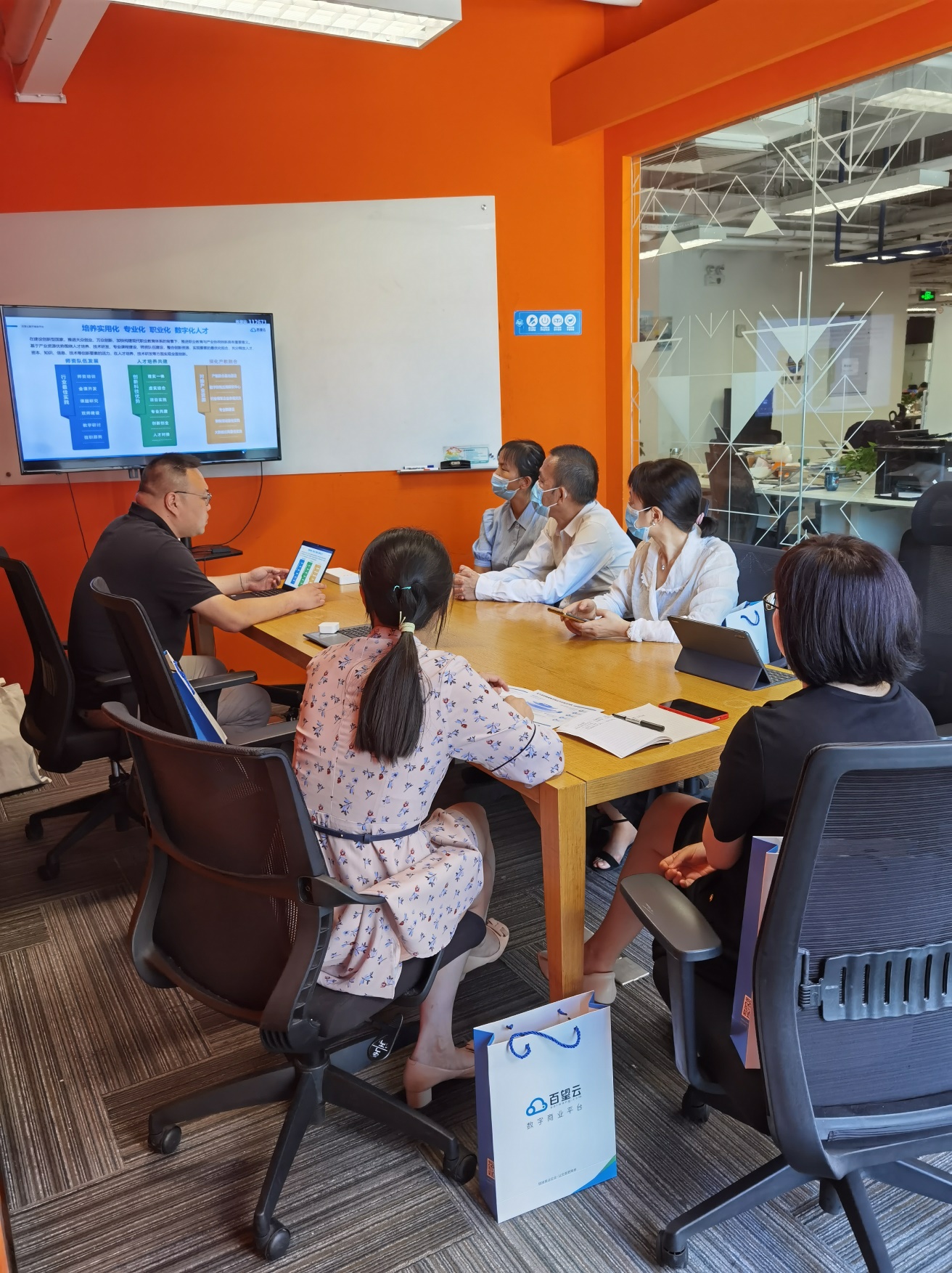 合作交流会由百望公司财税培训业务总经理吴迪主持。首先,吴迪总经理对陈娟副经理一行的到来表示热烈欢迎,并对此前与304am永利集团通过开展产学研合作取得的成果给予了充分肯定;然后,吴迪总经理本着“培养专业+技能双核人才,把产业案例搬进课堂,任务驱动式、递进式教学支撑”的合作理念,以“引领财税数字化变革,助力产教融合升级”为主线,从产业人才培养路径、课题研究、协同创新中心合作、税务大数据应用人才培养、数字税务虚拟现实教学应用、实习就业推荐等方面出发,对公司现有的产学研业务和合作院校案例进行了详细讲解展示,同时表达了与304am永利集团开展深入合作的强烈意愿。