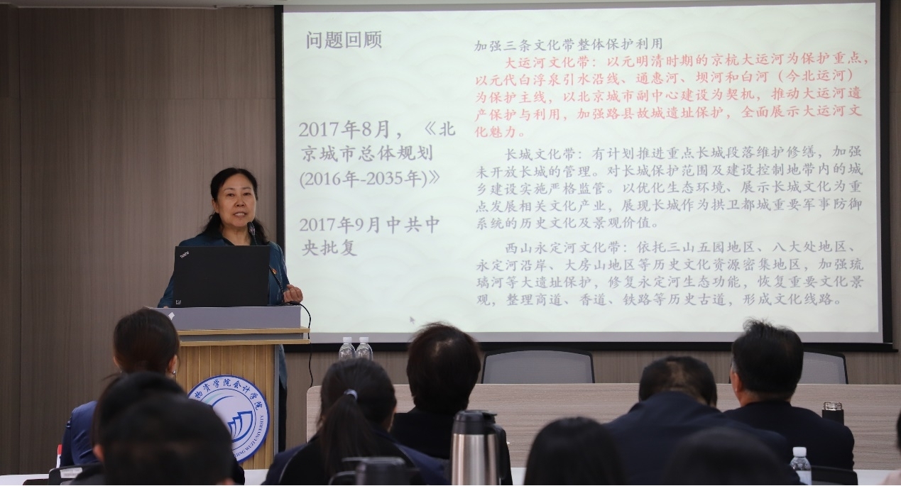 北运河管理处教授级高级工程师白文荣同志做了题为《大运河文化漫谈》的主题报告,白文荣同志从中国大运河概况、北京运河及文化遗产和运脉永续古今同辉三个方面详细介绍了大运河文化发展情况。她表示如今城市副中心再次以大运河为主线,建设打造水城共融、蓝绿交织、文化传承生态城;北京大运河是中国运河文化的华彩乐章,是北京文化遗产的典型代表,需要更多的了解它、保护它、传承它。