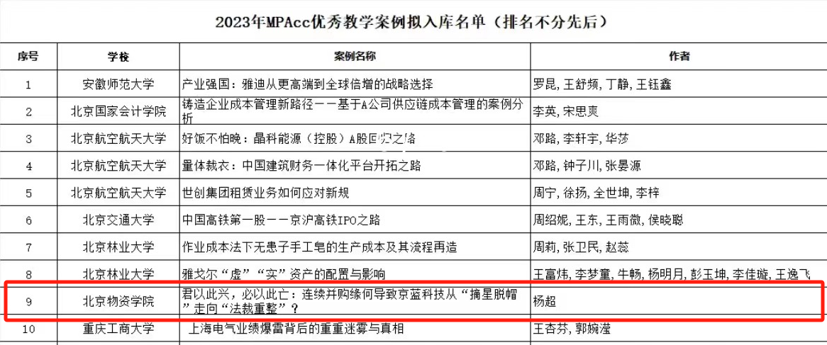 近日,全国会计专业学位(MPAcc)优秀教学案例组织委员会公布了2023年MPAcc优秀教学案例拟获奖和拟入库名单公示,由304am永利集团教师杨超编写的《君以此兴,必以此亡:连续并购缘何导致京蓝科技从“摘星脱帽”走向“法裁重整”?》经组委会评审,入选2023年MPAcc优秀教学案例拟入库名单。