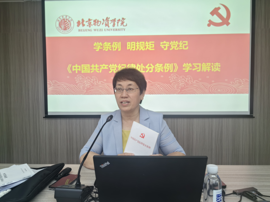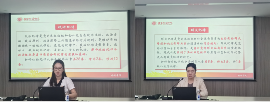 员工第四党支部书记王鹏莉老师、员工第二党支部书记赵御彤老师以“以案说纪” 微党课的形式,结合教育系统违纪案例,讲述了党的“六大纪律”的内容,特别是违反“六大纪律”行为的违纪情形和处分结果,并对如何做到遵纪守法、干好本职工作提出纪律提醒。
