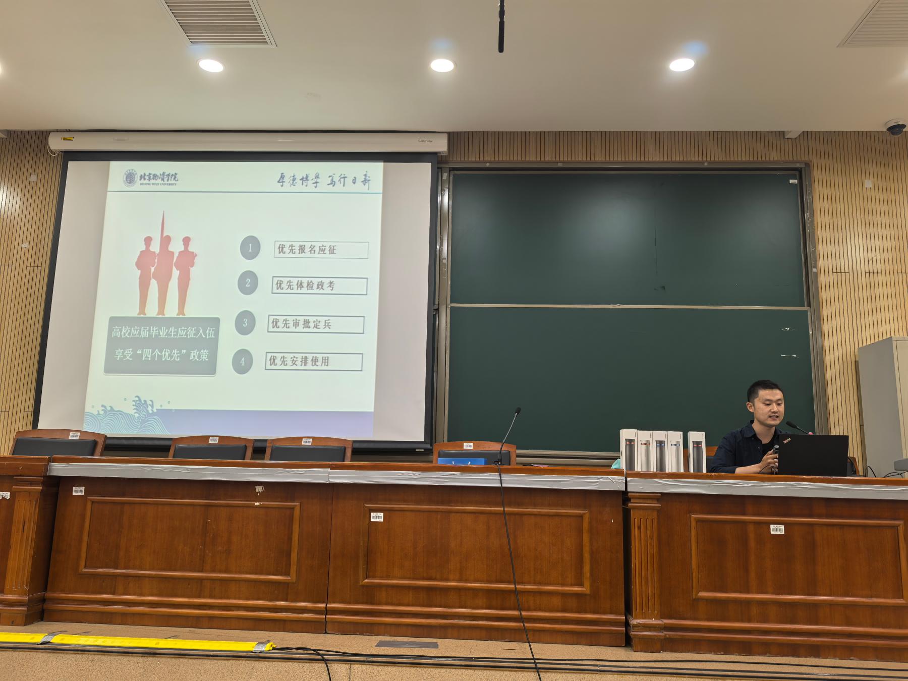 随后,辅导员梁昀老师为同学们介绍了毕业生参军入伍的相关政策和优惠待遇。他鼓励有意向参军的同学积极响应国家号召,投身国防事业,为实现中华民族伟大复兴的中国梦贡献自己的力量。同时,他还提醒同学们要提前做好准备,积极向学校武装部老师咨询相关信息,确保参军入伍的各项手续顺利办理。