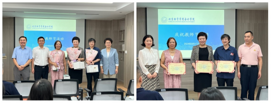 于海蛟副经理向全体教师送上节日的祝福,也向三位退休老师送上了美好的祝愿,他讲到,高校教师是一个令人羡慕的职业,学校也是一个充满爱和温暖的地方,能够在学校工作很幸福。于海蛟副经理向老师们介绍了学校食堂的改建和将要开工建设的后勤服务综合楼,并表示努力为学校和学院的发展多做实事,做好后勤服务和保障工作。离退休工作处处长申云贵向三位退休老师颁发了光荣退休证书,希望退休老师在人生的新阶段“启航新征程,扬帆再出发”,继续为教育事业做出新贡献。