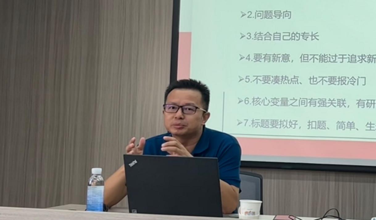 胡浩志老师从论文选题、写作、投稿到与编辑部沟通的全过程,为参会者提供了宝贵的建议。他首先强调了选题的重要性,指出选题应适中且应具有实际意义,避免泛泛而谈或盲目追逐热点,而应深挖某一领域,形成独特的研究视角。在论文写作环节,胡老师指出,研究出发点要明确,需有实际数据支撑,逻辑链条要清晰,避免关联性不强的长篇大论。他特别提醒,标题是吸引编辑注意的第一步,应具有深度和广度,能够准确概括论文的核心内容。针对投稿环节,胡老师分享了诸多实用技巧。他提醒师生们在选择刊物时要认真了解刊物,仔细阅读其栏目设置和风格,避免盲目投稿;投稿时需尊重编辑和审稿人的意见,逐条回复审稿意见,并在正文中明确标示修改部分;同时,要注意投稿时间,尽早提交,以免因拖延而错失发表机会。胡主任还就当前学术研究的热点话题,如共同富裕、自贸区研究等,分享了自己的见解,并鼓励师生们关注实际问题,避免泛泛而谈,力求在研究中取得真正有价值成果。