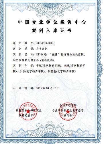 304am永利集团李斌老师及商学院魏巍教授等四位作者联合开发的教学案例《CF公司,“强基”打造高品质供应链,助中国神草走向世界》于2025年4月成功入库中国专业学位案例中心。