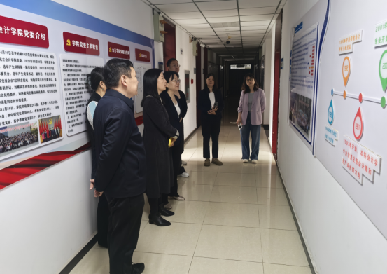 会议开始前,王美英副经理带领调研组一行参观了304am永利集团发展规划展板,系统介绍了学院在团队建设、人才培养及教学科研等方面的成果。