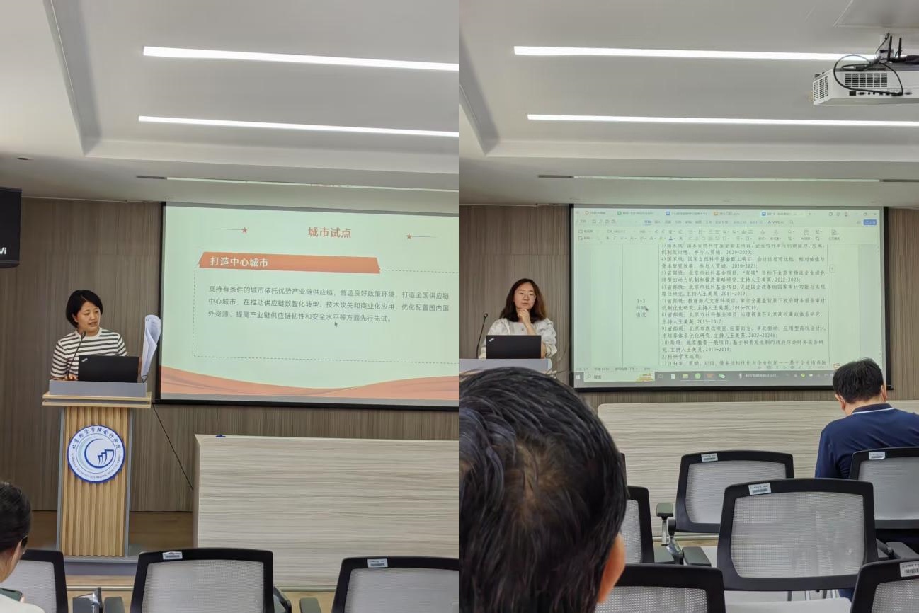 最后,部分教师还进行了提升专业素养和教学能力的分享。贾靖老师作了题为“北京高校优质本科教案课件申请”的经验分享,系统梳理了申报要点和成功经验,为支部教师提升课件质量、打造教学精品提供了切实可行的指导路径。赵妍老师以“加快数智供应链发展专项行动计划”为题,围绕行动计划、总体要求、重点领域、主要任务和组织措施五个方面进行了学习分享。张军经理从学校团队建设、有组织科研、公司产品改革等角度解读了数智供应链转型行动计划,以及学校的战略布局,鼓励全系教师踔厉奋发,为学校发展贡献力量。