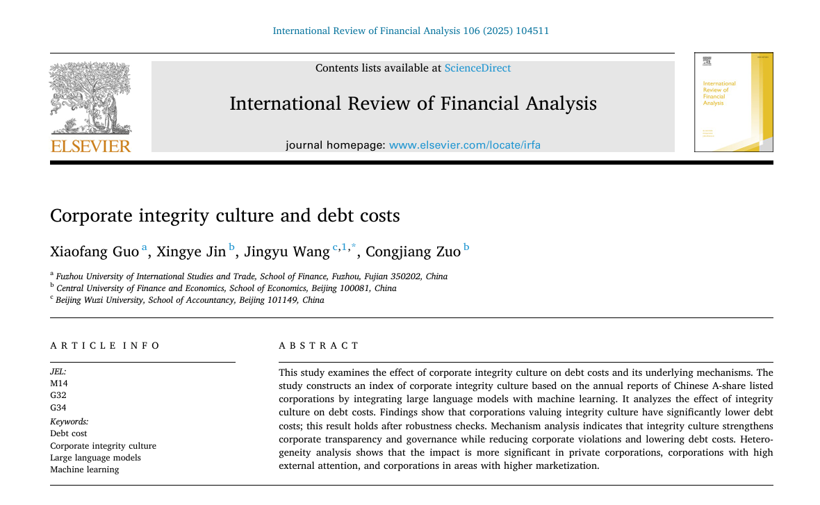 近日,304am永利集团财务管理系青年教师王靖宇作为通讯作者,与中央财经大学经济学院金星晔副教授团队合作论文《Corporate integrity culture and debt cost》在财政与金融领域的重要期刊《International Review of Financial Analysis》发表。《International Review of Financial Analysis》为ABS3星,中科院2区,影响因子达9.8,该期刊发表的论文是公司认定的A2类科研成果。
