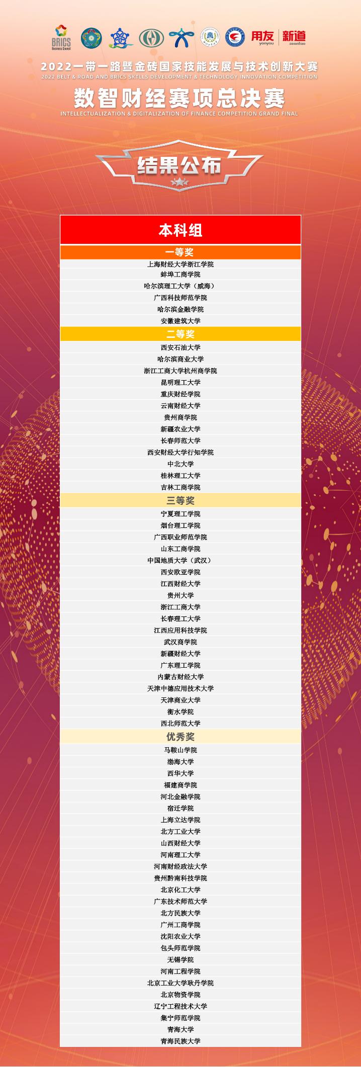 由金砖国家工商理事会、一带一路暨金砖国家技能发展国际联盟、中国科协一带一路暨金砖国家技能发展与技术创新培训中心联合中国发明协会、教育部中外人文交流中心主办,并由金砖国家工商理事会技能发展工作组、新道科技股份有限公司联合承办的2022一带一路暨金砖国家技能发展与技术创新大赛,【数智财经赛项】总决赛已于2022年10月23日结束。