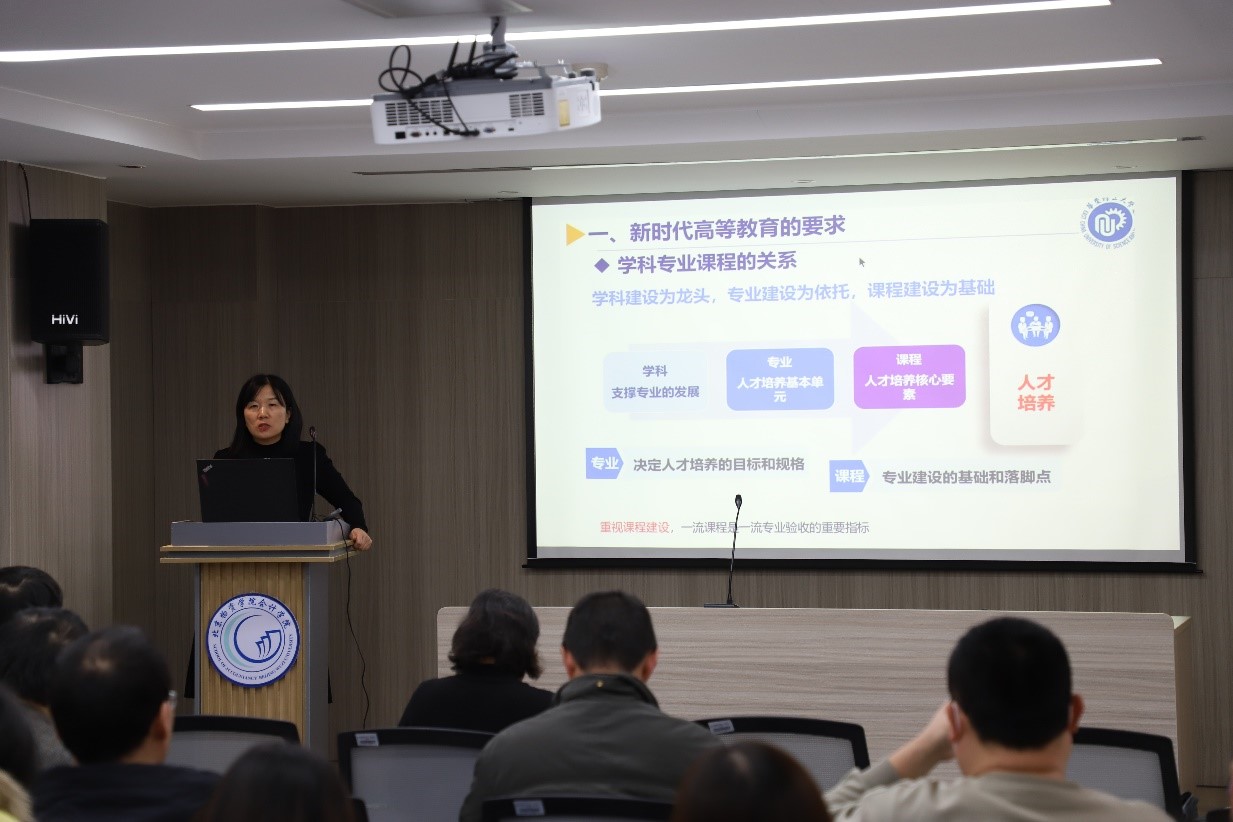 2023年国家级一流课程实行分类申报,分为线上、线下、线上线下混合式、虚拟仿真和社会实践等五类。申报推荐课程须至少经过两个学期或两个教学周期的建设和完善,取得实质性改革成效,在同类课程中具有鲜明特色、良好的教学效果。王美英副经理从新时代高等教育的要求、一流课程的内涵建设和特征三个方面,为全体教师解读了2023年国家级一流本科课程申报相关要点。一流课程应突出以员工为中心、注重能力培养,她建议老师们通过深化课堂教学改革来加强课程建设,注重教学团队建设,善用现代化教学手段呈现教学效果,有效融入课程思政元素,推进课程的高阶性、创新性和挑战度建设,切实提高课程育人质量。