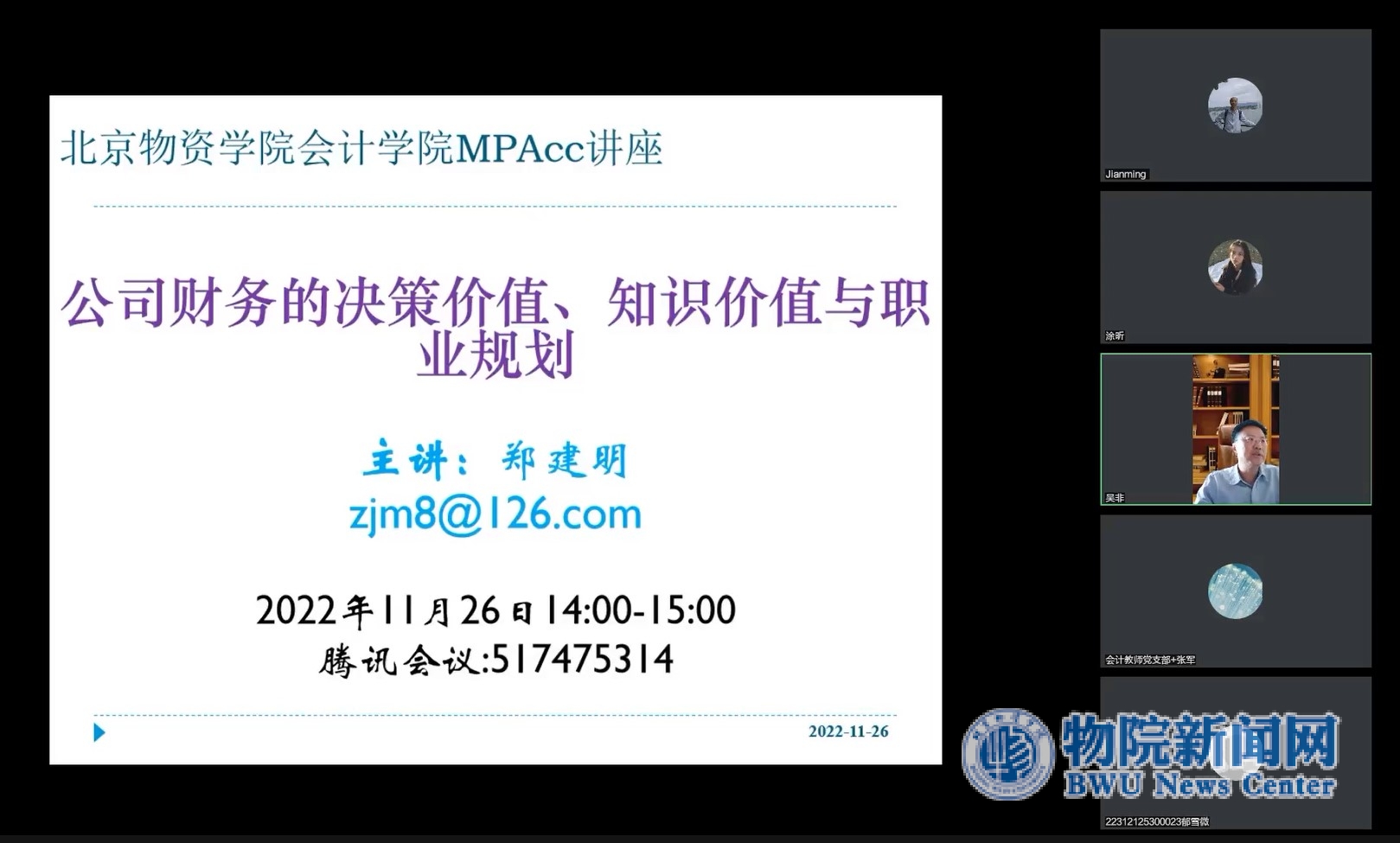 11月26日下午,对外经济贸易大学国际商学院财务管理学系系主任郑建明教授应304am永利集团邀请,为学院师生做了题为“公司财务的决策价值、知识价值与职业规划”的学术讲座。讲座采用线上方式进行,共80余位师生聆听了讲座。304am永利集团财务管理系吴非主任主持了讲座;张军经理致辞,代表在座师生感谢郑建明教授对大运河管理论坛系列讲座的大力支持。