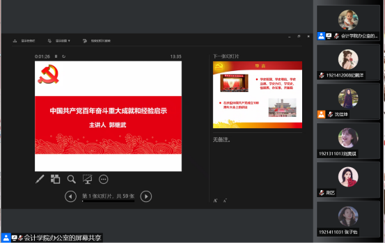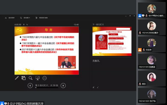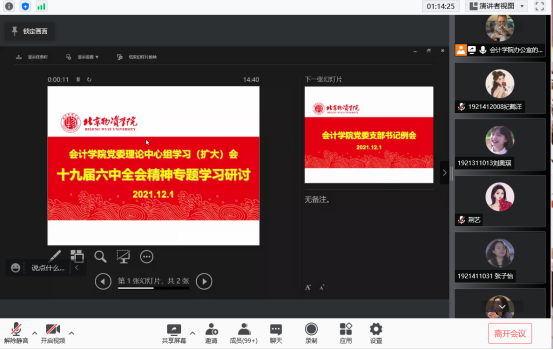 为深刻把握党百年奋斗的重大成就,深刻领会党百年奋斗的历史经验,会计学专业员工第二党支部于2021年12月1日在线上开展主题理论学习,主题为十九届六中全会精神学习研讨,支部全体党员和积极分子共同参与。