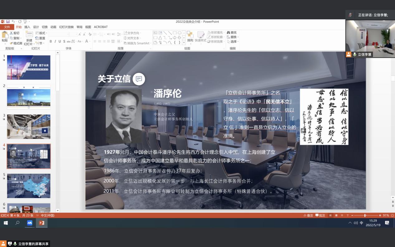 与会人员共同收看了立信会计师事务所及立信央企事业总部的企业宣传片。人力资源部经理刘薇娅对立信会计师事务所以及立信央企事业总部的发展历史、主营业务、当前发展规模和企业文化等作了介绍。特别介绍了每天接收员工进行实习和就业的情况,以及在事务所工作中的人才培养和发展通道。