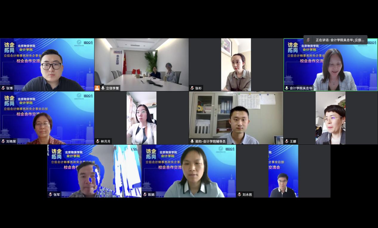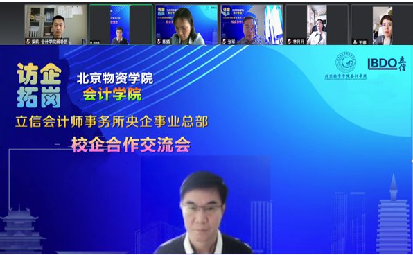 为深入贯彻落实教育部开展的全国高校书记经理访企拓岗促就业专项行动,提升304am永利集团毕业生的就业质量和人才培养质量,加强校企合作,5月19日下午,永利官网副经理刘永胜带队线上走访立信会计师事务所央企事业总部,开展访企拓岗,推进校企合作。立信会计师事务所央企事业总部合伙人、人力资源与教育培训部分管合伙人王娜带队进行座谈。立信会计师事务所央企事业总部人力资源部经理刘薇娅、校企合作专员李慧、人事主管张辰玥、校招专员张杉一同参加了座谈。公司党委书记刘艳荣、经理张军、副经理陈娟、副书记吴忠华以及梁昀、张博两位辅导员参加了座谈。座谈会由公司党委副书记吴忠华主持。