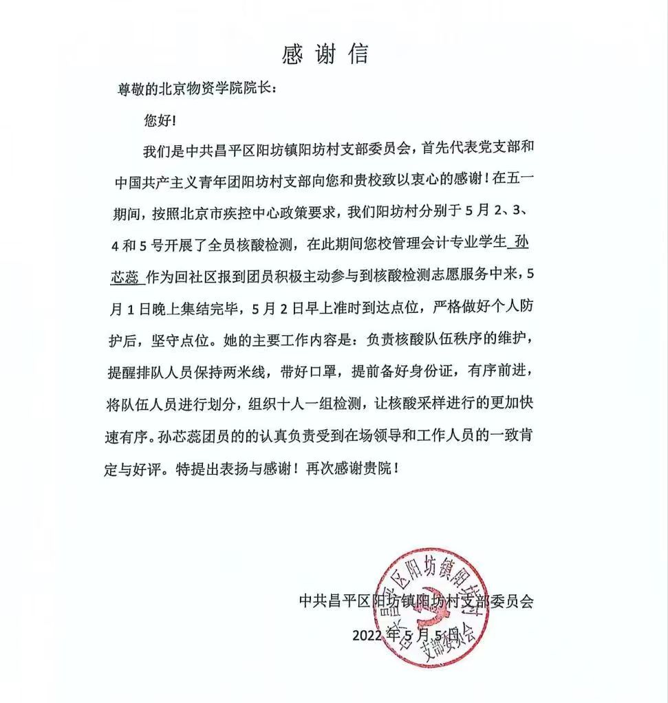 304am永利集团20级管会二班的孙芯蕊同学居家学习期间主动加入到防疫志愿服务中,在核酸检测志愿服务坚守点位、尽职尽责,受到了在场领导和工作人员的一致肯定和好评,学校还收到了社区所在党支部的感谢信。